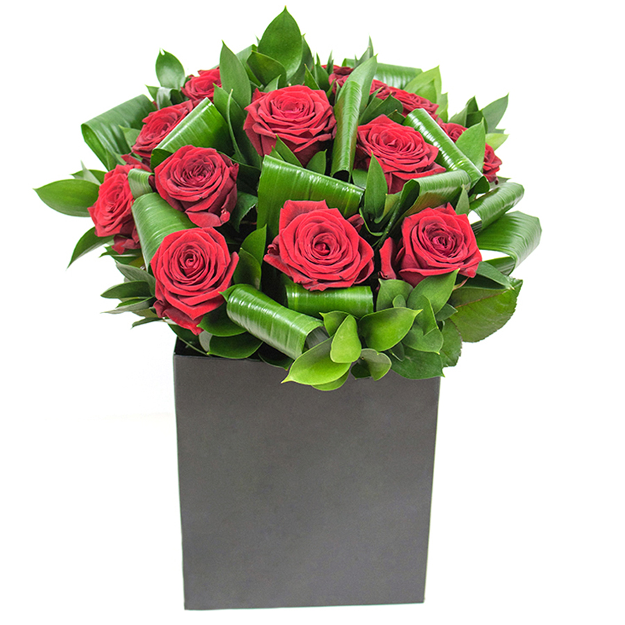 Our elegant red rose bouquet combines vibrant red roses with luxurious aspidistra leaves and delicate ruscus. This beautifully designed arrangement adds sophistication and charm to any setting.